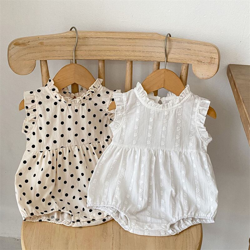 2024夏新作 レトロ風 女の子 ノースリーブ ロンパース 立ち襟 ドット柄 カバーオール 出産祝い