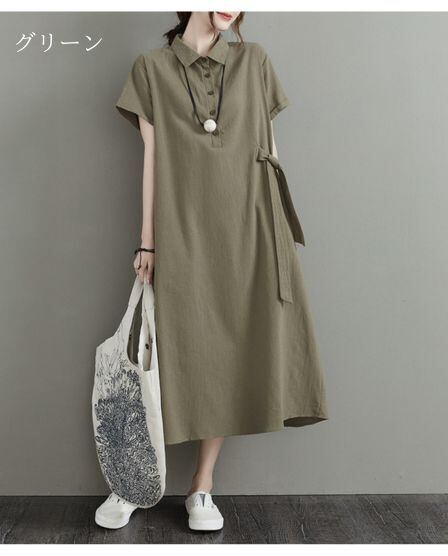 綿と麻の半袖 ワンピース ルーズポケット カジュアルドレス