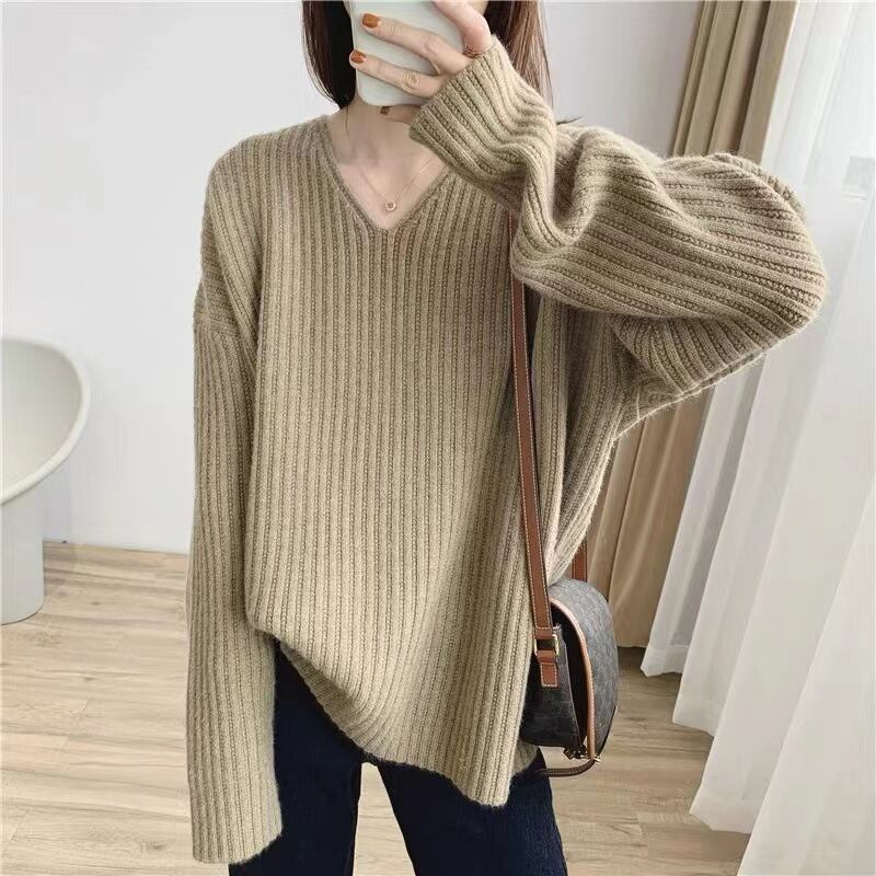 ルーズ V ネック長袖ソフトセーター 韓国スタイルの スリムニットボトムシャツトップ