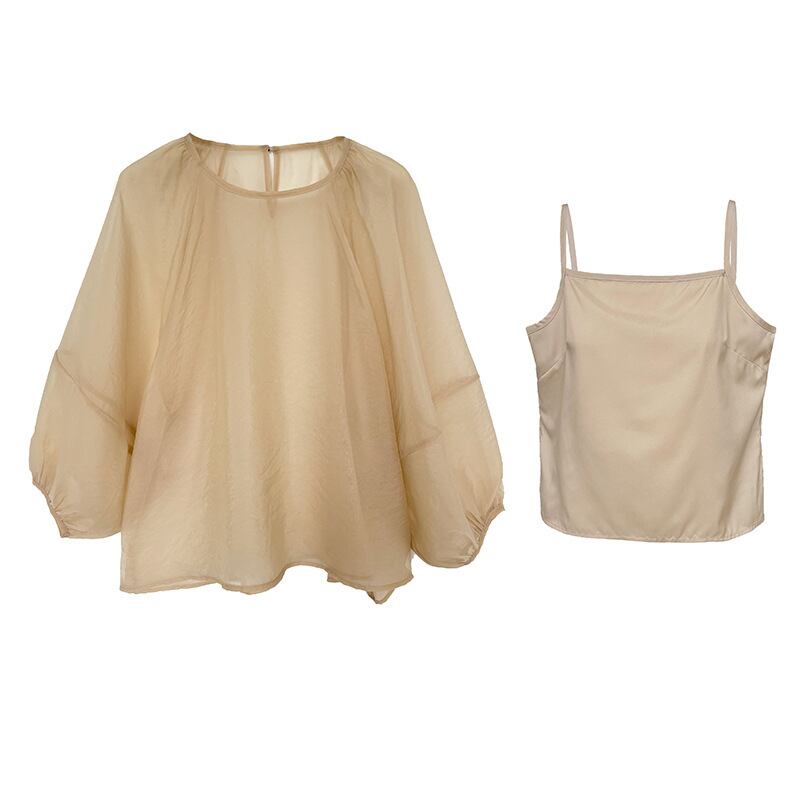 バルーン スリーブ シアー カットソー ブラウン ベージュ ブラック