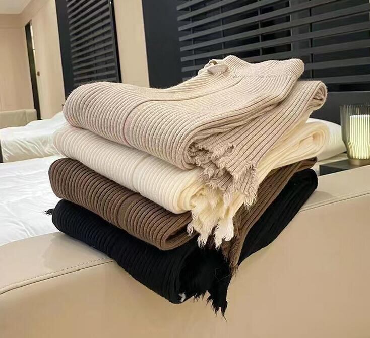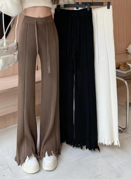 新作・レディースズボン・ゆとり・高い腰・ワイドパンツ・フリンジ・ニット